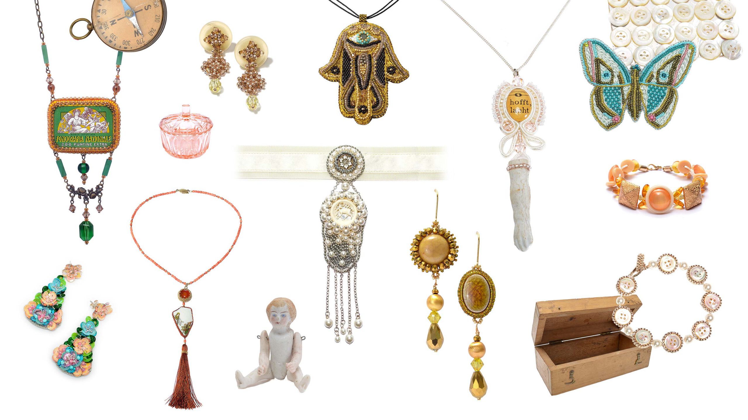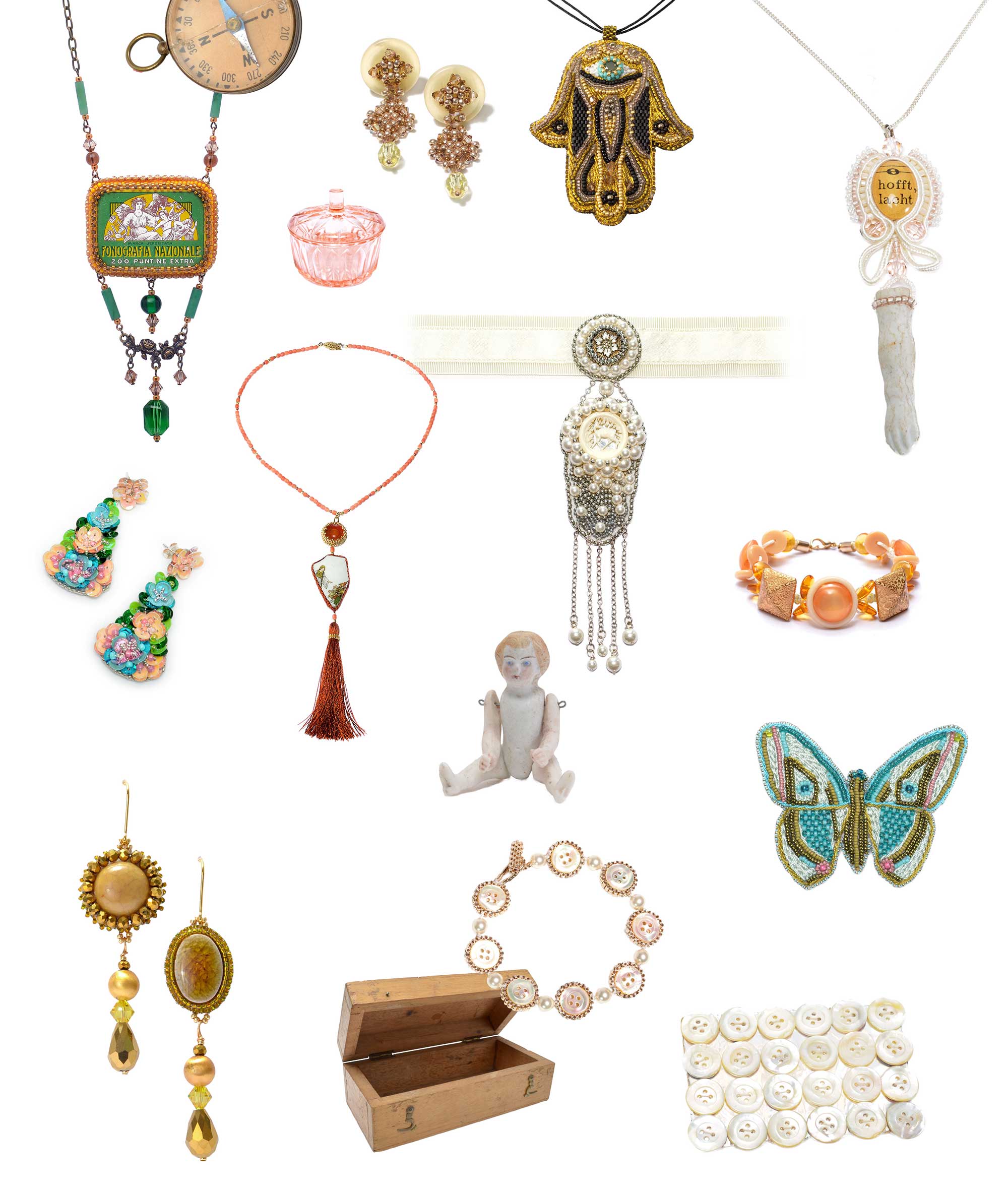 Handgefertigte Unikate aus Fundstücken, Glasperlen und besonderen Materialien.