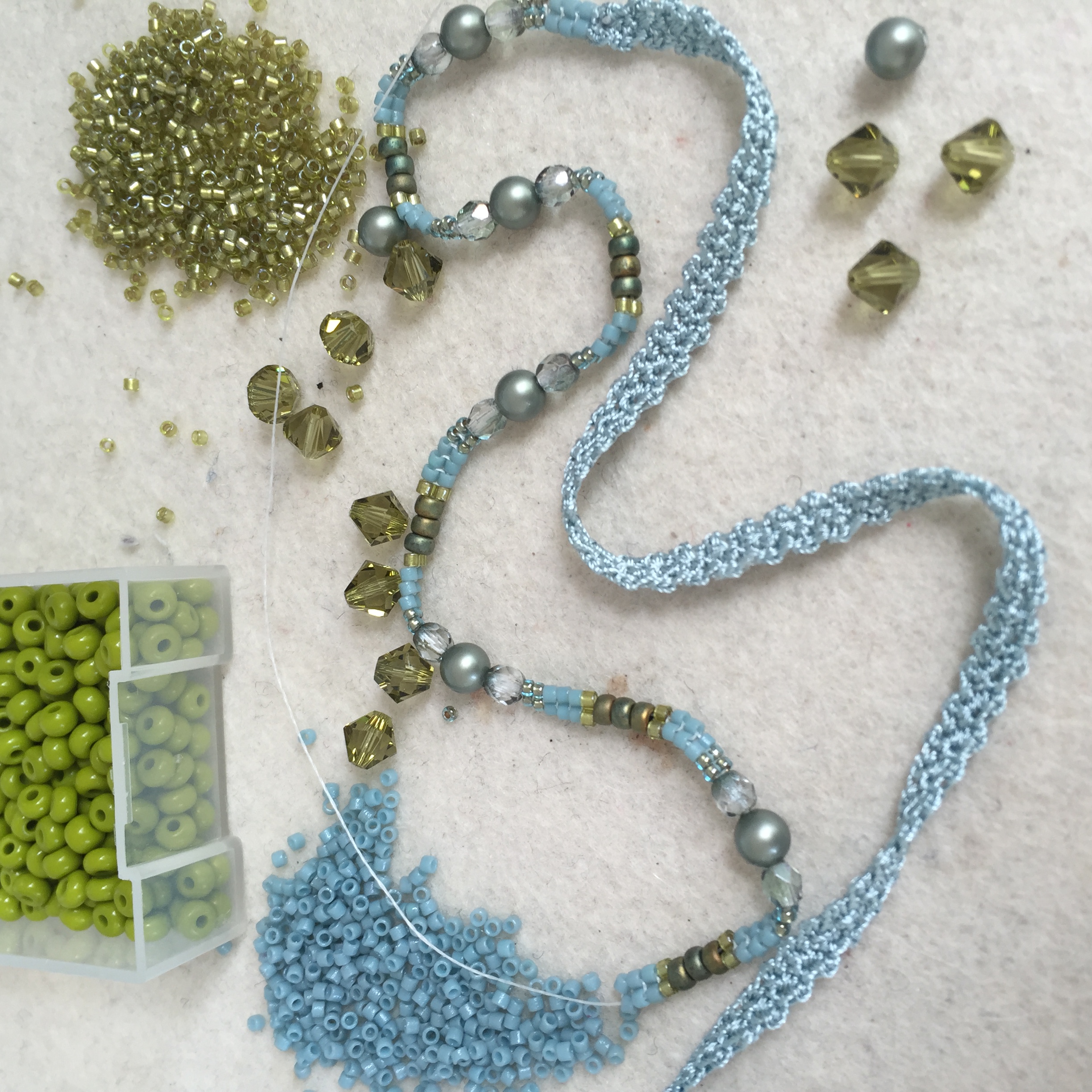 Perlenarmband mit Häkelband in türkisgrün in Arbeit