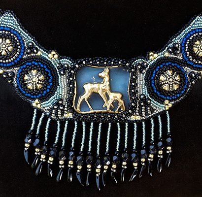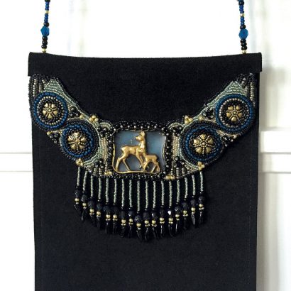 Die Klappe ist aufwendig bestickt und mit sorgfältig ausgewählten Vintage-Elementen verziert, die der Tasche ihren besonderen, individuellen Charakter verleihen. Funkelnde Glasperlen setzen feine Akzente und unterstreichen den handgearbeiteten Schmuckcharakter dieses Einzelstücks.