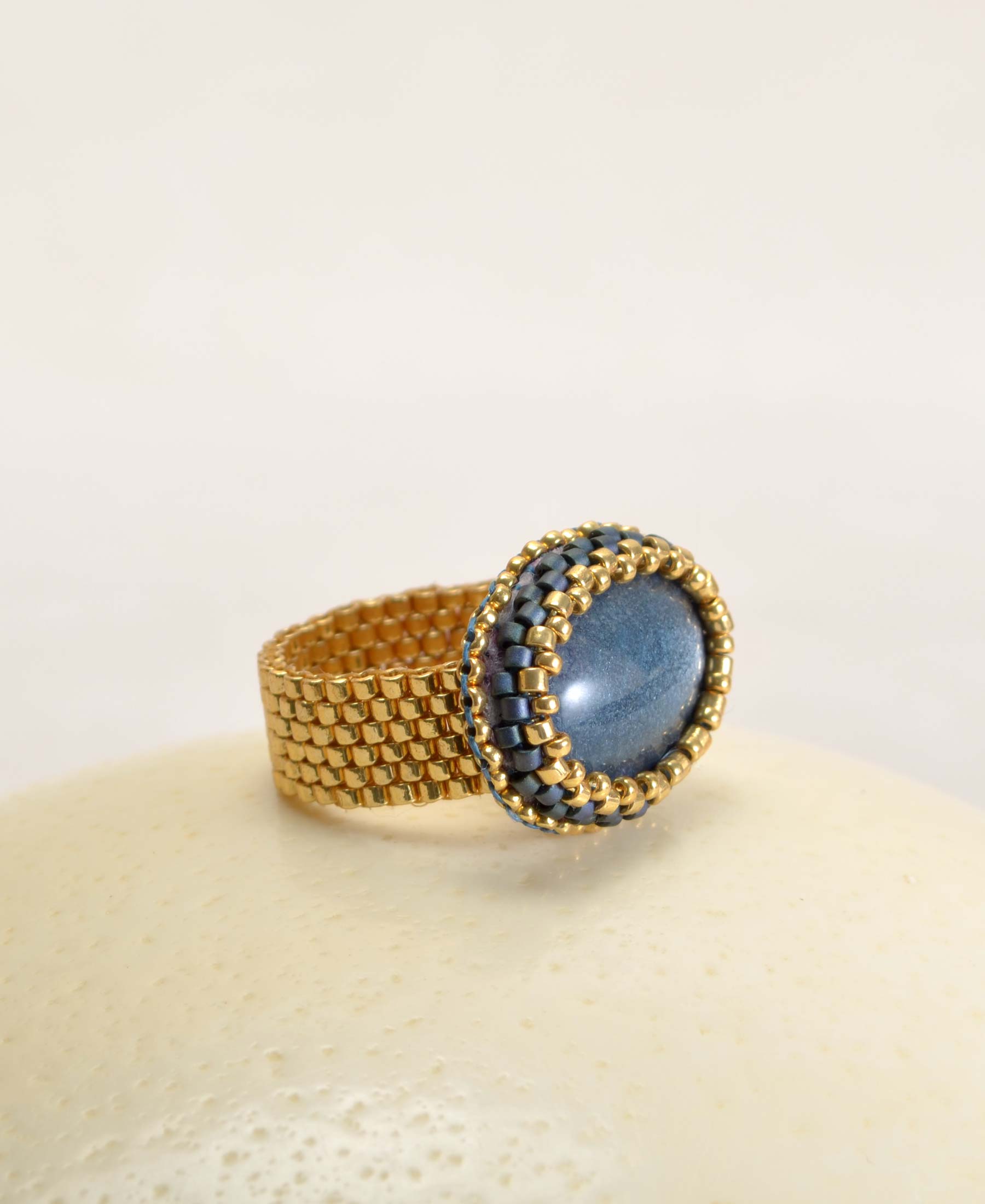 Mit feinen Glasperlen eingefasster jeansfarener Glascabochon auf feinem Peyote-Goldband.