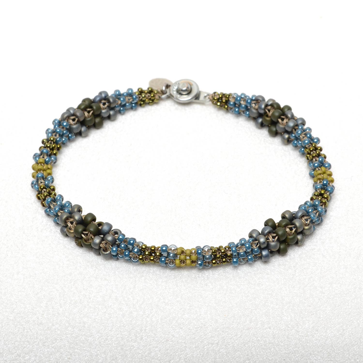 Perlenarmband aus kleinen Glasrocialles in schillerdem mattgrau, olivgrün und jeansfarben