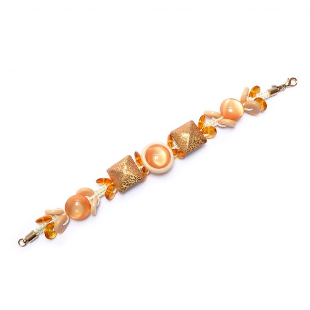 Cremefarbenes Makrameearmband mit goldenen Vintageknöpfen, Ring aus Bein und farbig passenden Glasdiscs.